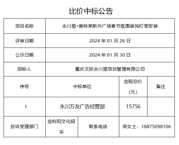 永川里•奥特莱斯外广场春节氛围装饰灯笼安装比价中标公告